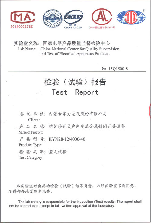 KYN28-12/4000-40中置式開關(guān)柜(檢驗(yàn)報(bào)告)