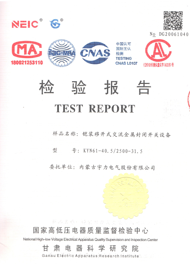 KYN61-40.5/2500-31.5鎧裝式開關(guān)柜(檢驗(yàn)報(bào)告)